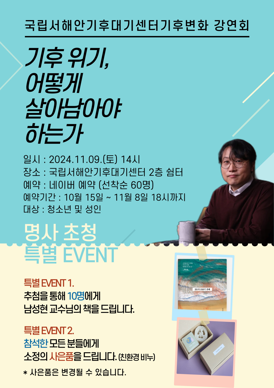 안녕하세요! 국립서해안기후대기센터 입니다:) 국립서해안기후대기센터 기후변화 강연회 남성현 교수의 <기후 위기, 어떻게 살아남아야 하는가>. 일정 안내입니다. 일시 : 2024.11.09.(토) 14시 장소 : 국립서해안기후대기센터 2층 쉼터 예약 : 네이버 예약 (선착순 60명) 예약기간 : 2024.10.15 ~ 11.08 18시까지 대상 : 청소년 및 성인