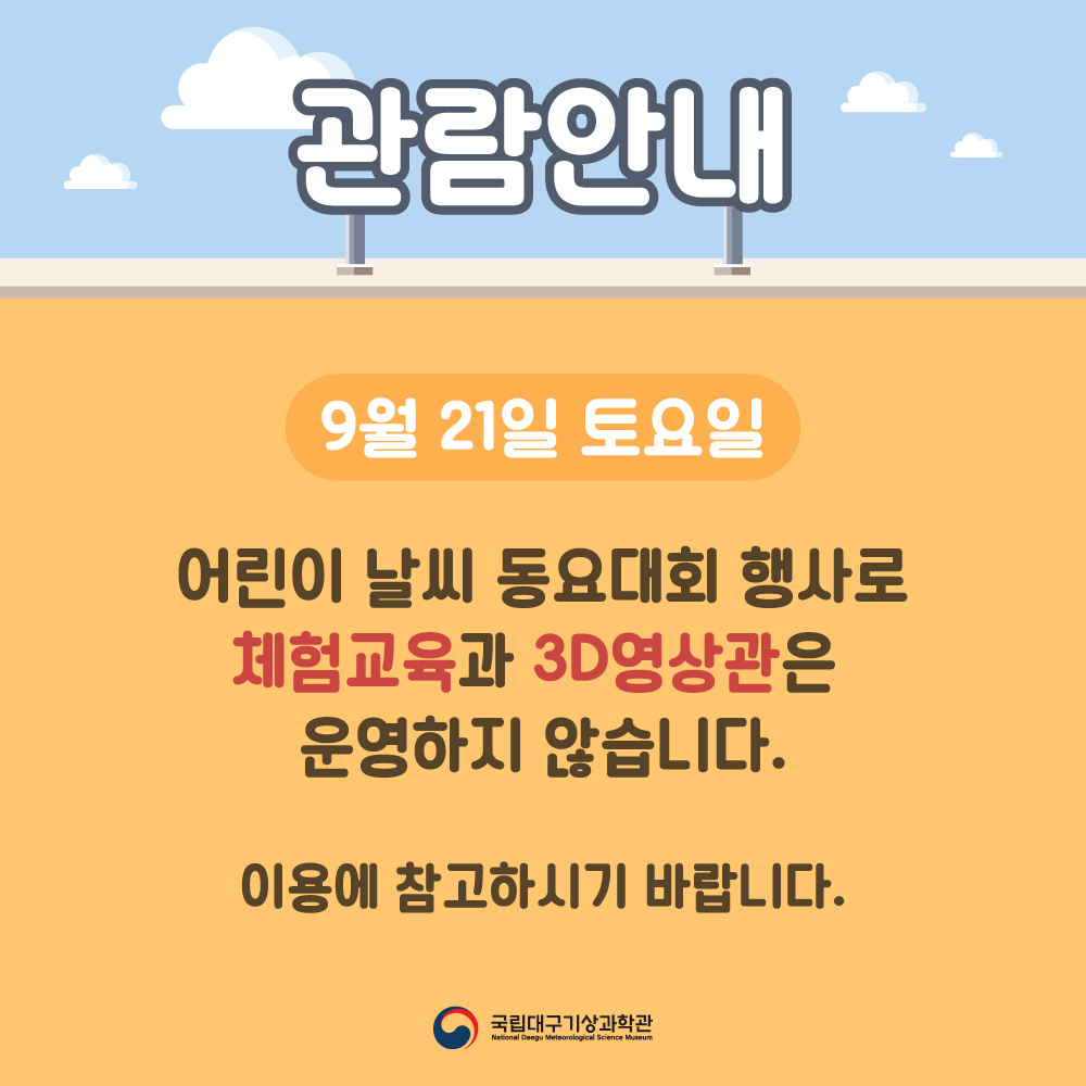 국립대구기상과학관, 9/21 운영변경(체험교육, 3D영상관)