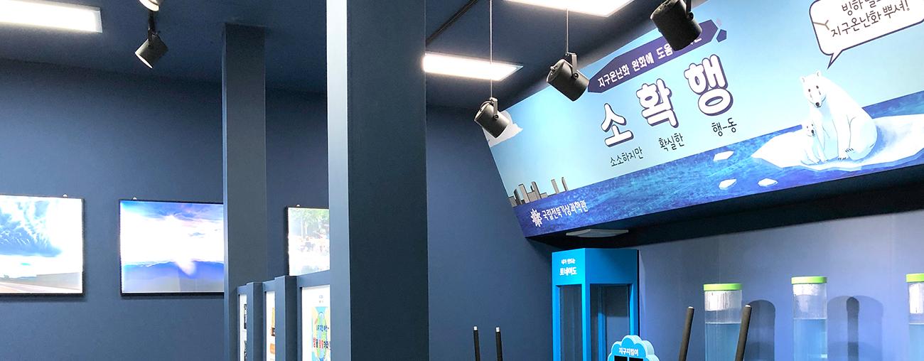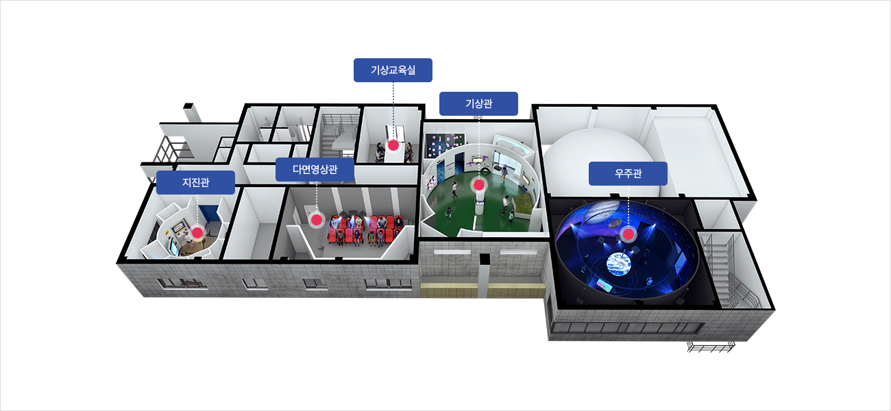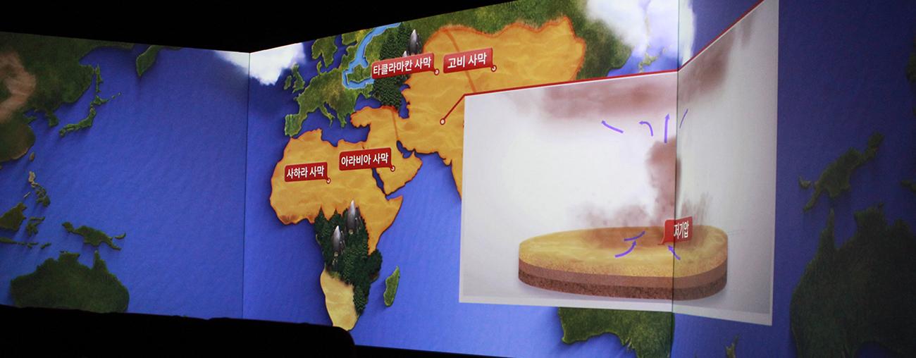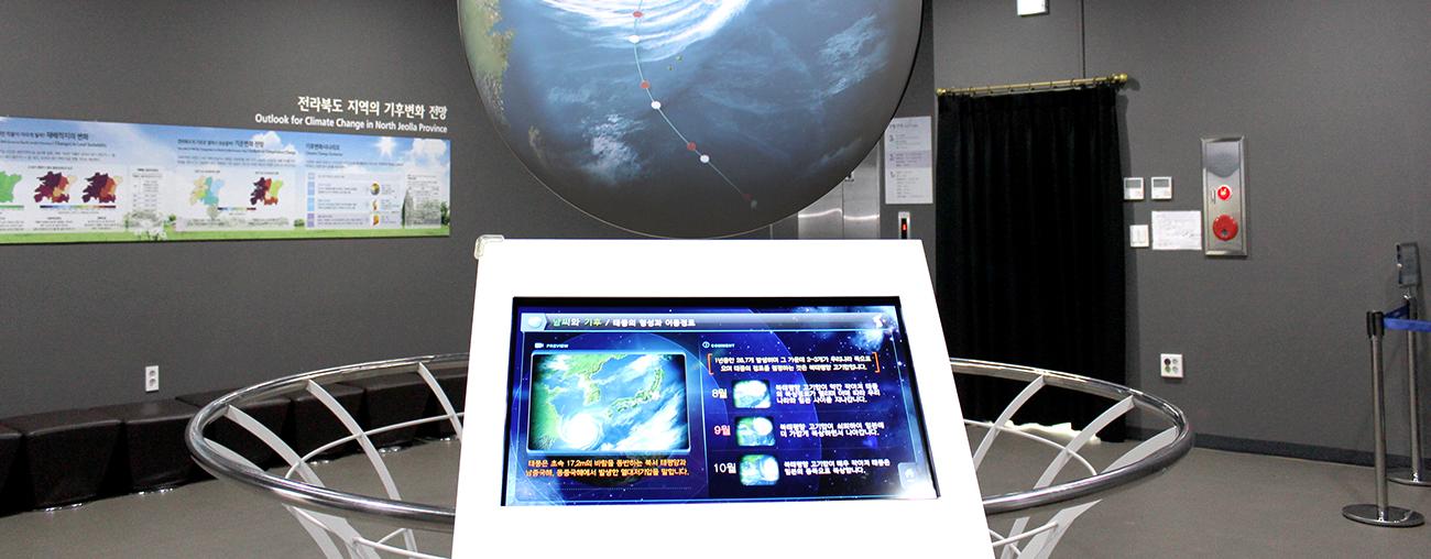 3차원 지구 가시화 시스템을 통해 우주에서 직접 보는 것과 같은 효과를 구현하여 대형 지구모형으로 실시간 기상상황이나 기후변화와 관련된 내용을 학습하고 체험할 수 있는 공간입니다.