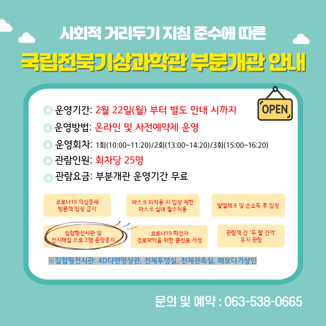 사회적 거리두기 지침에 따라 국립전북기상과학관은 부분적으로 전시관을 개관하여 운영합니다. 코로나19 확산 방지와 국민의 안전을 지키기 위한 조치이오니 관람객 여러분의 협조를 부탁드립니다.