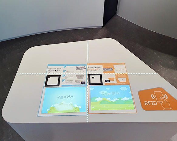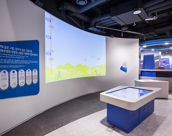 미디어테이블과 벽면스크린을 통해 다양한 구름의 종류와 구름의 특성, 생성 위치에 대해 알아보고 나만의 구름을 만들어 볼수 있는 체험 코너