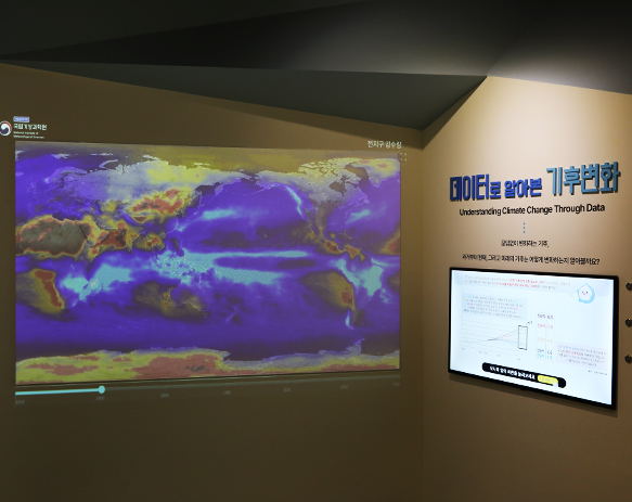 자석 모형을 붙여 표출되는 영상을 통해 세계 곳곳에서 발생한 이상기상 현상을 소개